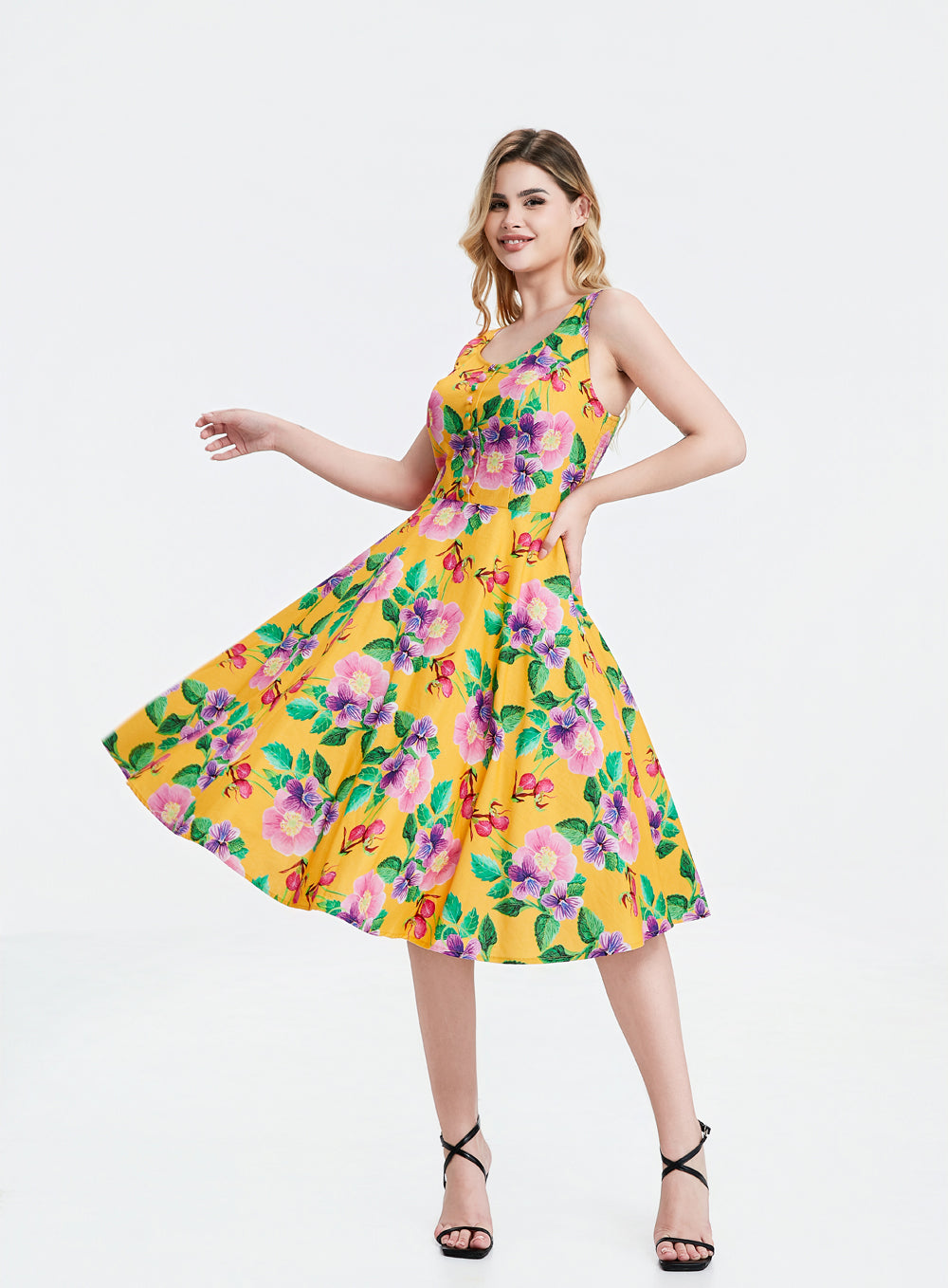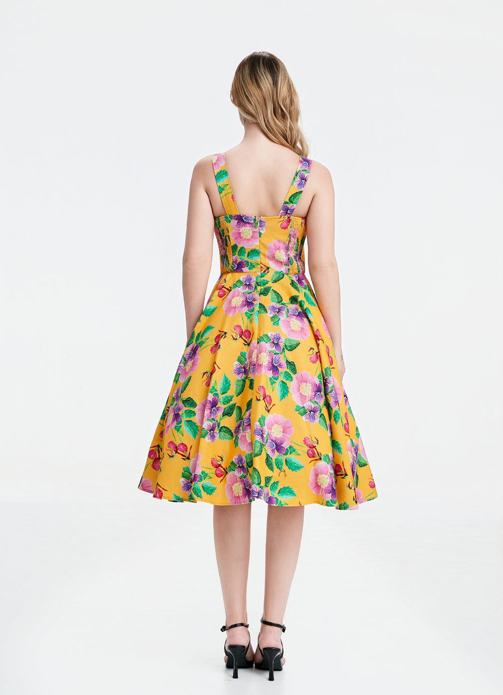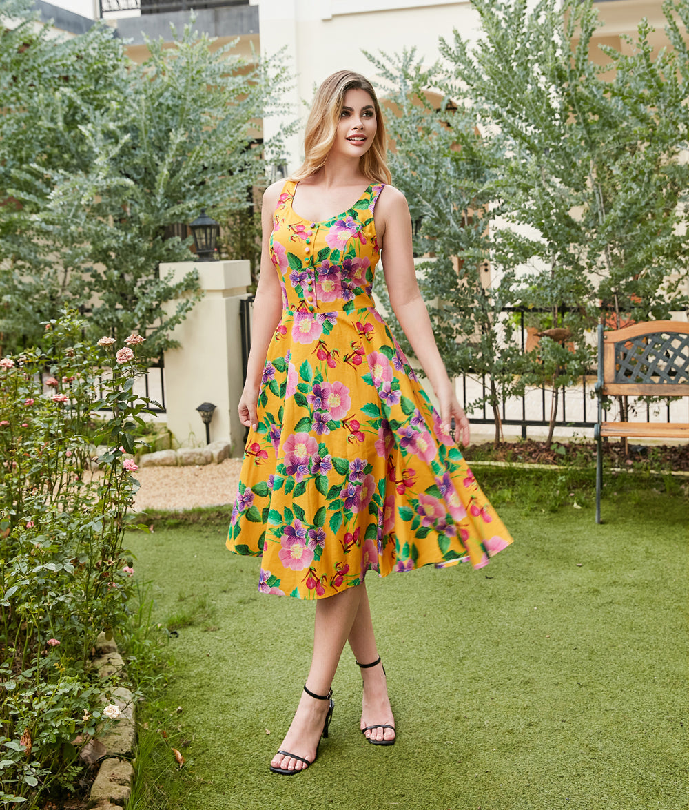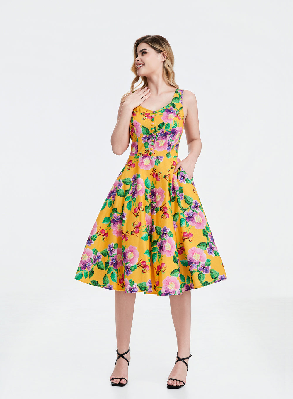 "Our beloved Wild Floral Medley is back and brighter than ever! This bestselling print bursts with bold blooms in pink and purple, set against a sunshine-yellow backdrop. It’s guaranteed to make you smile."