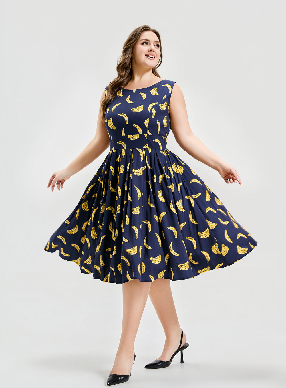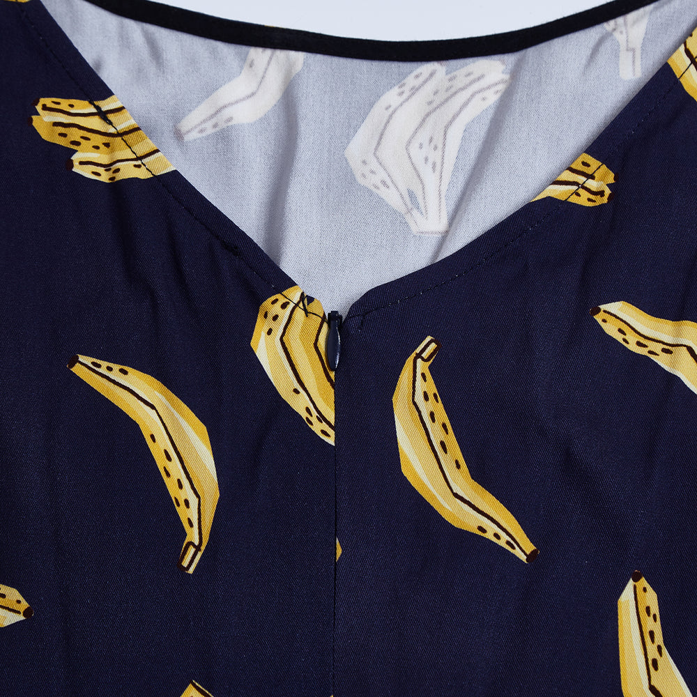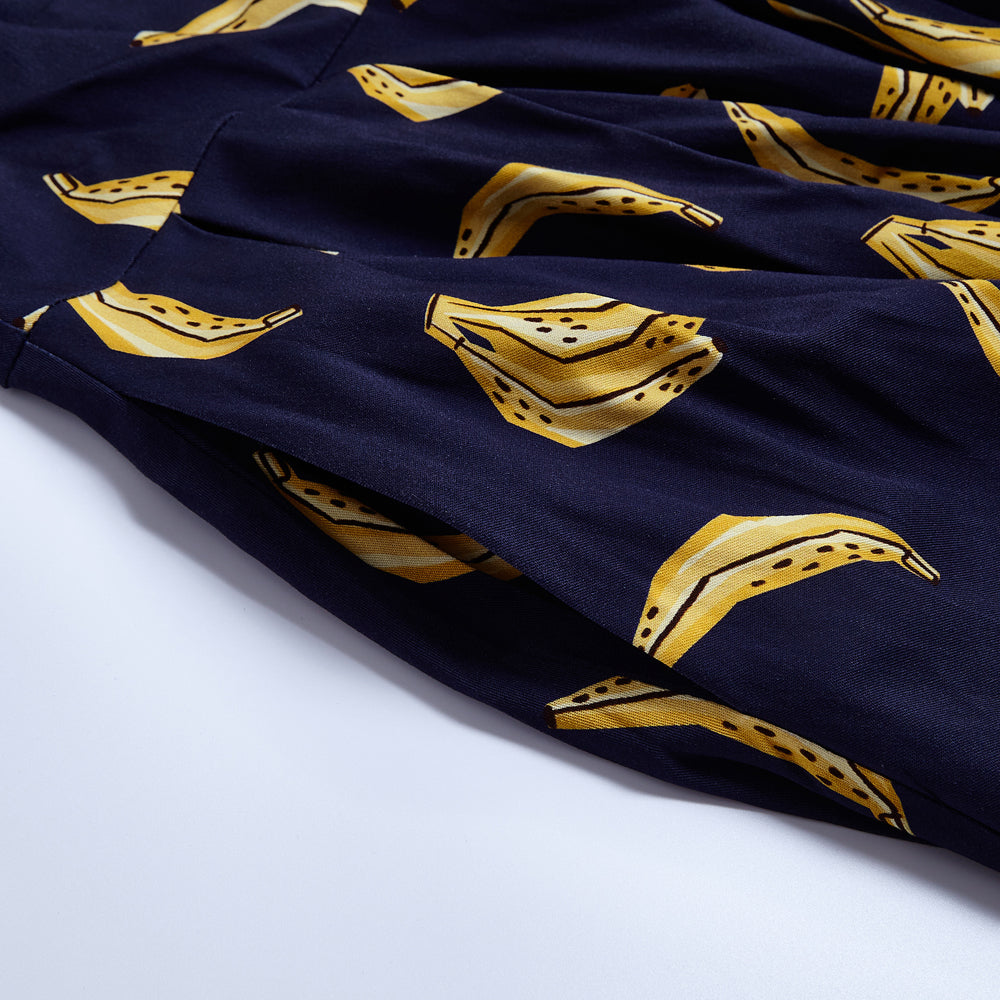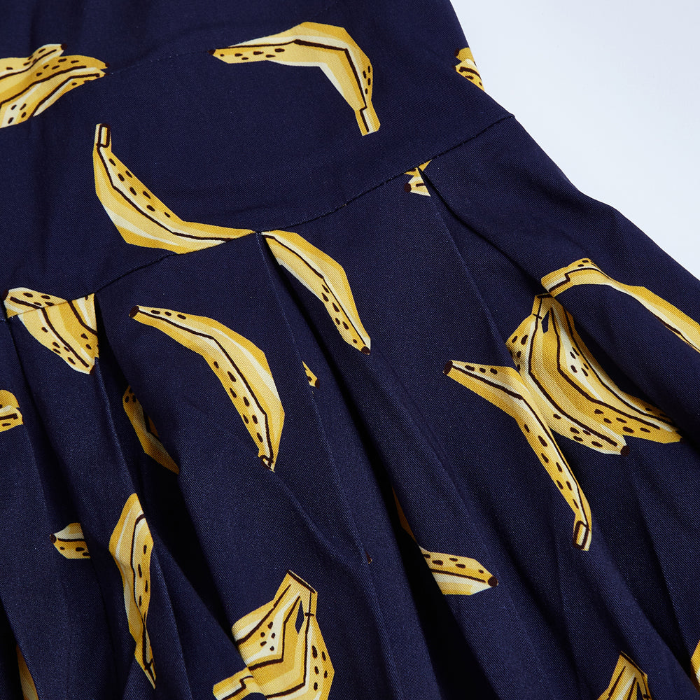 "Our Lily silhouette has gone bananas—literally! This playful navy dress brings back our best-selling banana print for a look that’s fruity, flirty, and full of fun."