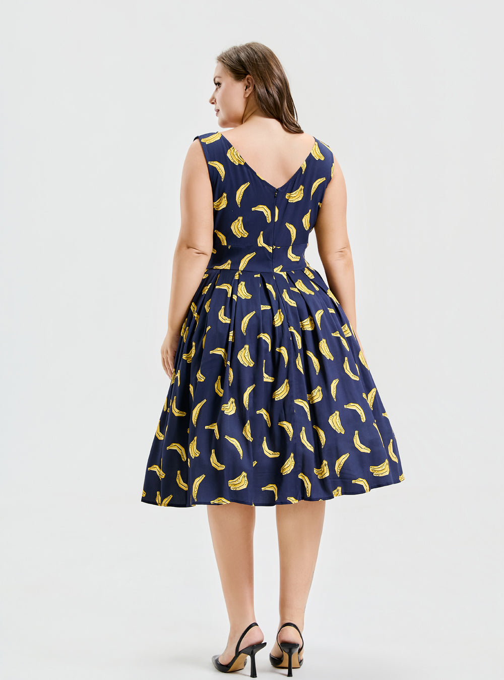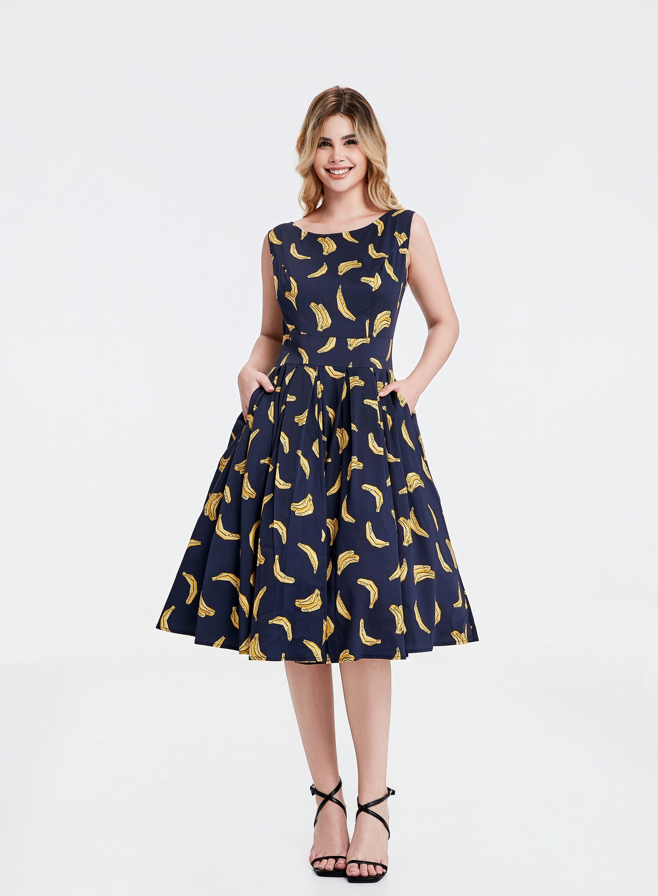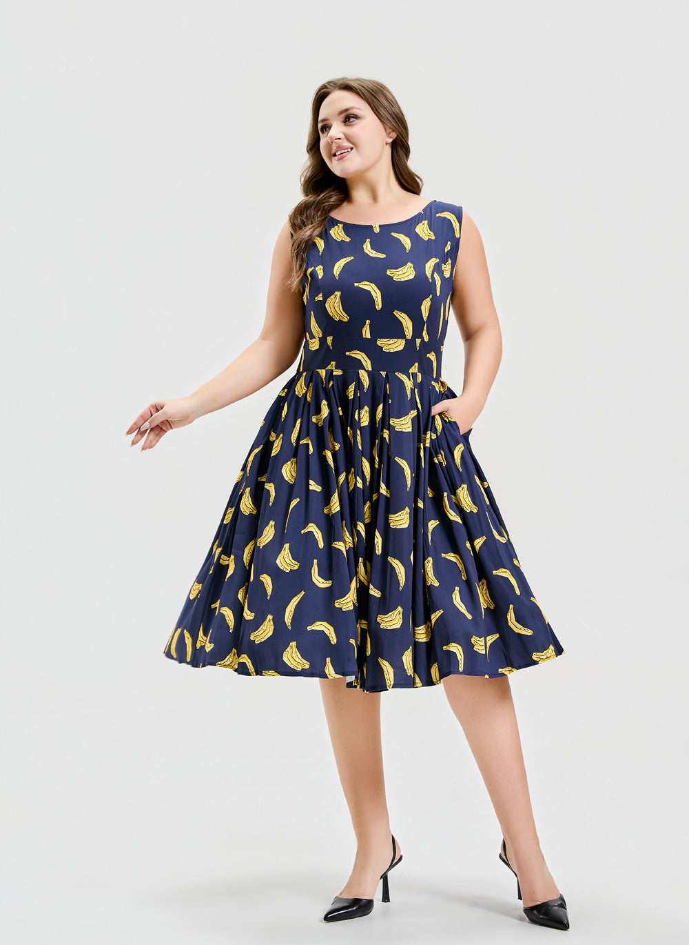"Our Lily silhouette has gone bananas—literally! This playful navy dress brings back our best-selling banana print for a look that’s fruity, flirty, and full of fun."