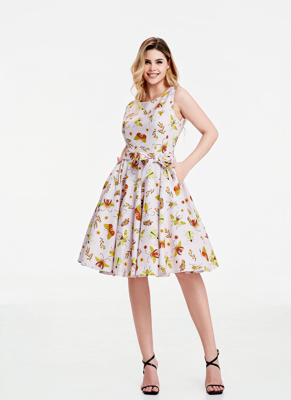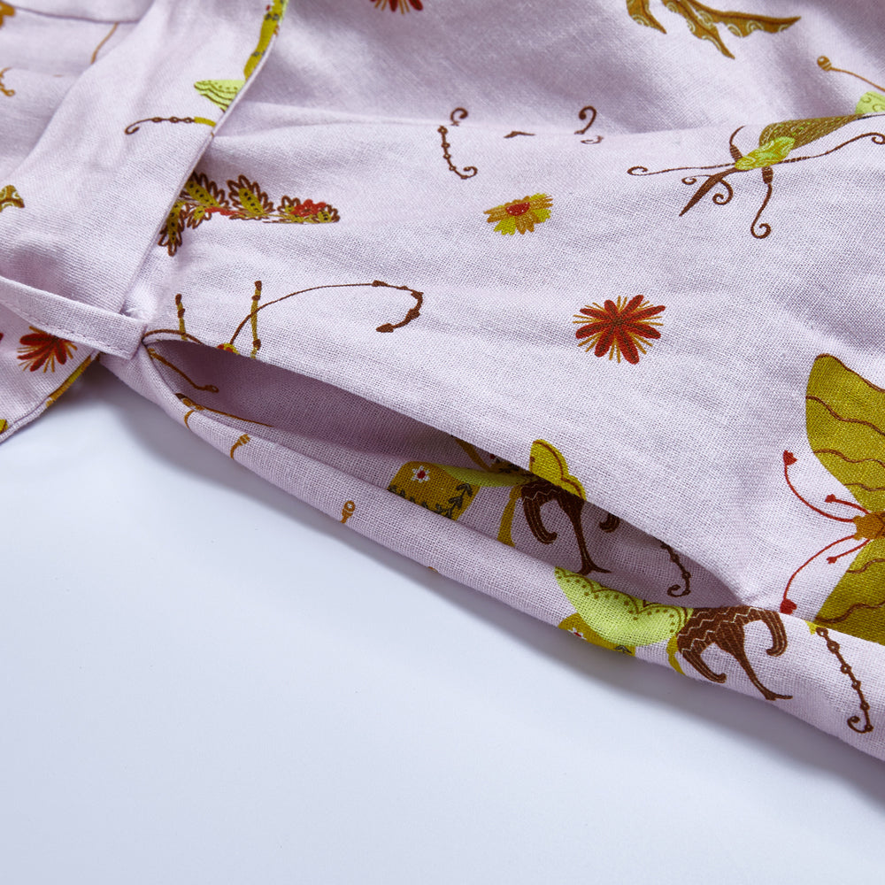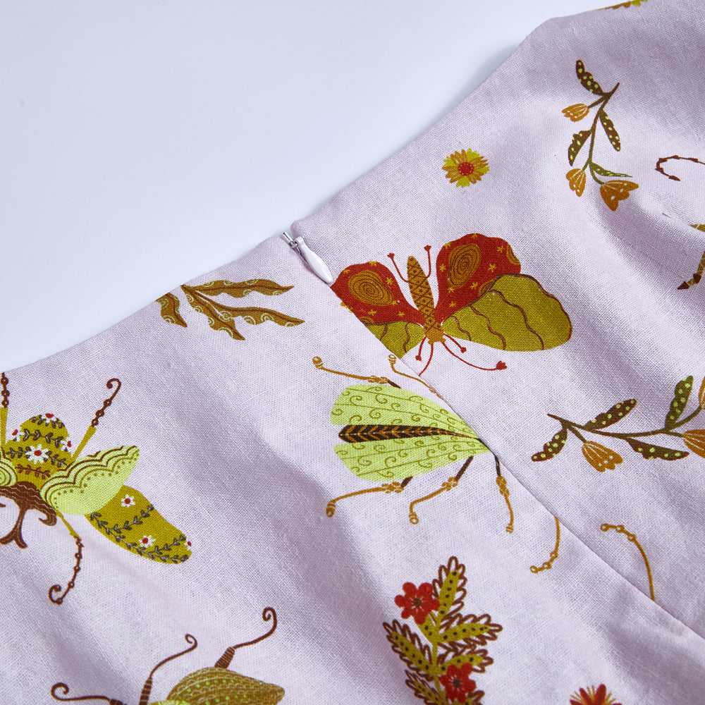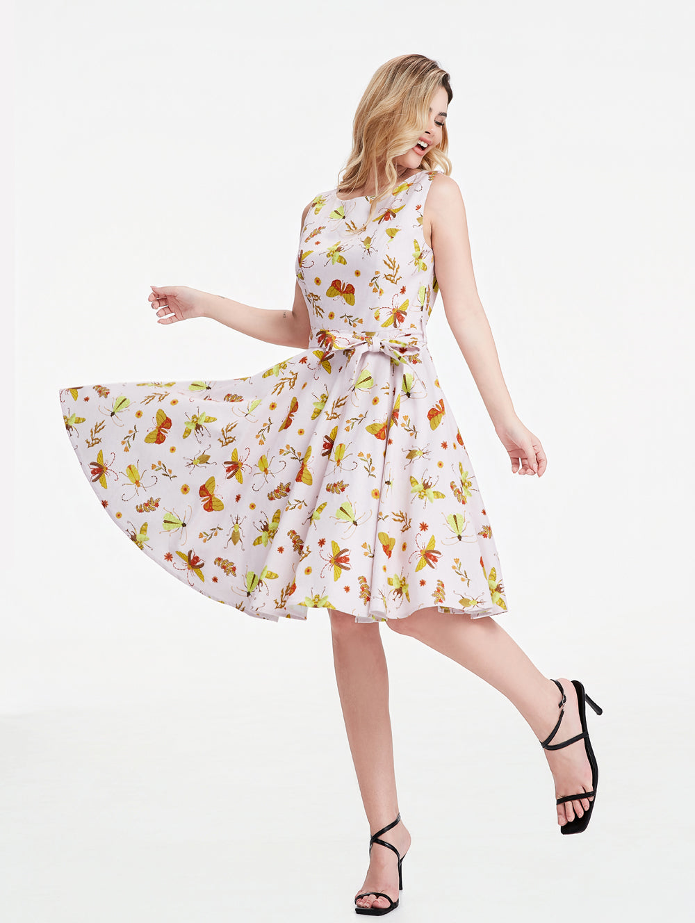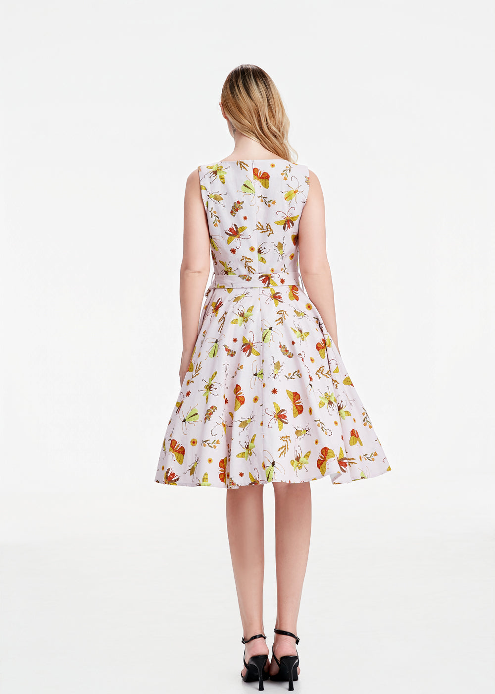 "Our beloved Summer Nights print is back, now in a fresh new colorway! Previously a favorite in navy, this season it takes flight on a soft pink background. The delicate mix of fluttering wings and wildflower sprigs makes this dress a dreamy blend of vintage charm and playful whimsy."